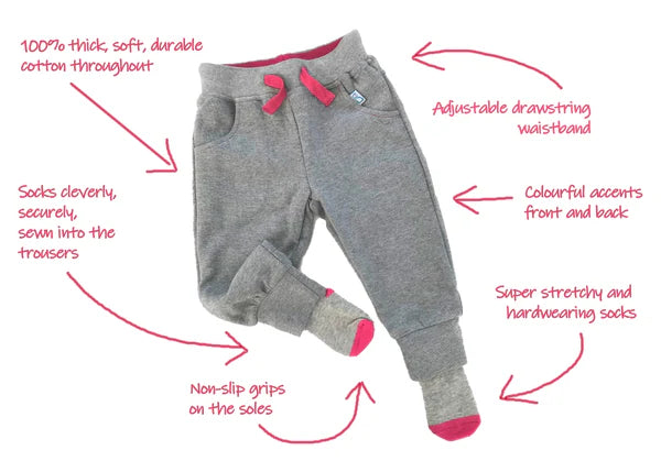 Cosy baby joggers with socks securely built in so no more lost baby socks.